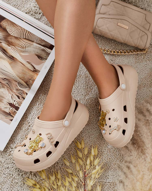 - Отличные ажурные женские резиновые шлепанцы на плоской подошве. Они имеют съемные украшения из циркония на верхней части. Отличный выбор для отпуска!