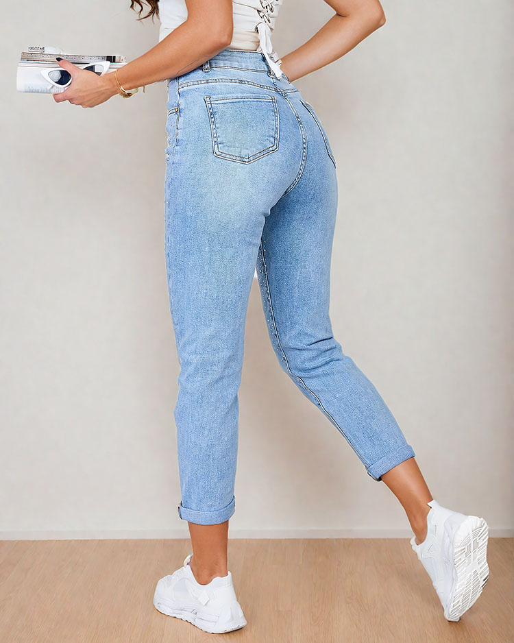 - Классические женские джинсовые брюки-бойфренды с высокой талией. Модель застегивается на молнию и пуговицу. Декорирована цирконами. Идеальный вариант для повседневных нарядов! ПРИМЕЧАНИЕ: Точность измерений (+/-) 1 см.