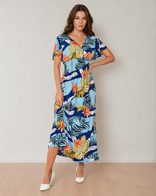- Уникальное женское платье из легкой ткани. Изделие длины миди, с короткими рукавами и вырезом сердечком. Модель украшена принтом. Почувствуйте лето в этой модели!