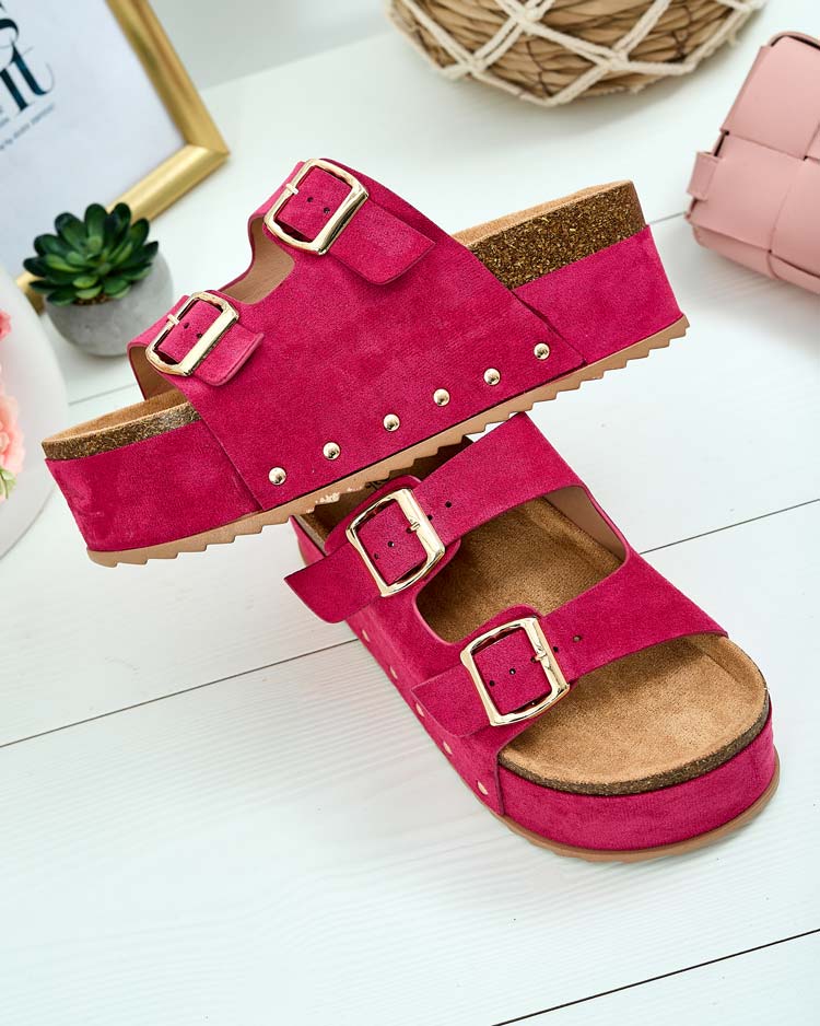 - Отличные женские шлепанцы на платформе. Выполнены полностью из экологичной замши. Имеют декоративные пряжки на верхней части. Подошва декорирована материалом а'ля пробка. Отличный выбор для отпуска!