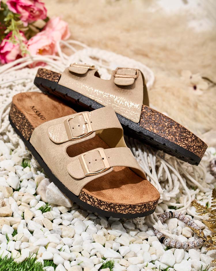 - Отличные женские шлепанцы на плоской подошве. Изготовлены полностью из экологичной кожи. Имеют декоративные пряжки на верхней части. Подошва декорирована материалом а'ля пробка. Отличный выбор для отпуска!