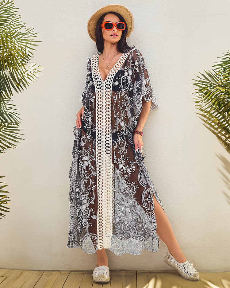 - Легкая и приятная на ощупь женская пляжная туника, выполненная из хлопковой ткани. Модель с V-образным вырезом горловины, короткими рукавами, декорирована кружевом. Прямой крой обеспечивает посадку на любую фигуру! ПРИМЕЧАНИЕ: Точность измерения (+/-) 1 с
