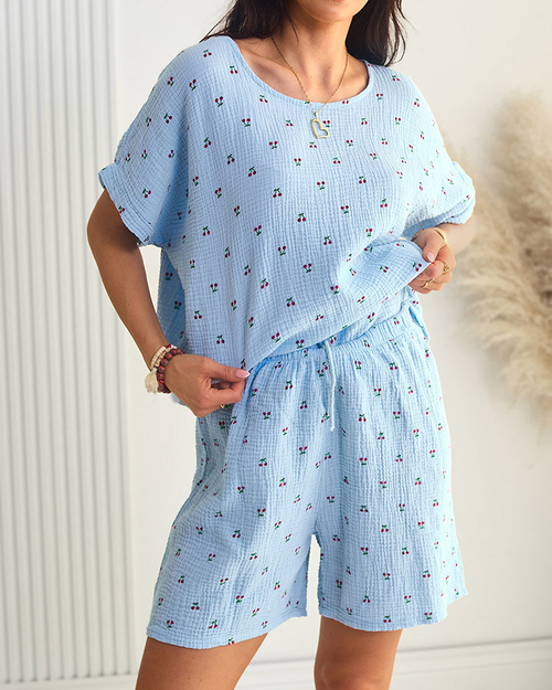 - Женский комплект из приятного на ощупь материала. Модель имеет декоративный принт. Блузка с короткими рукавами и короткие шорты с эластичным поясом. Почувствуйте лето в этом замечательном комплекте!