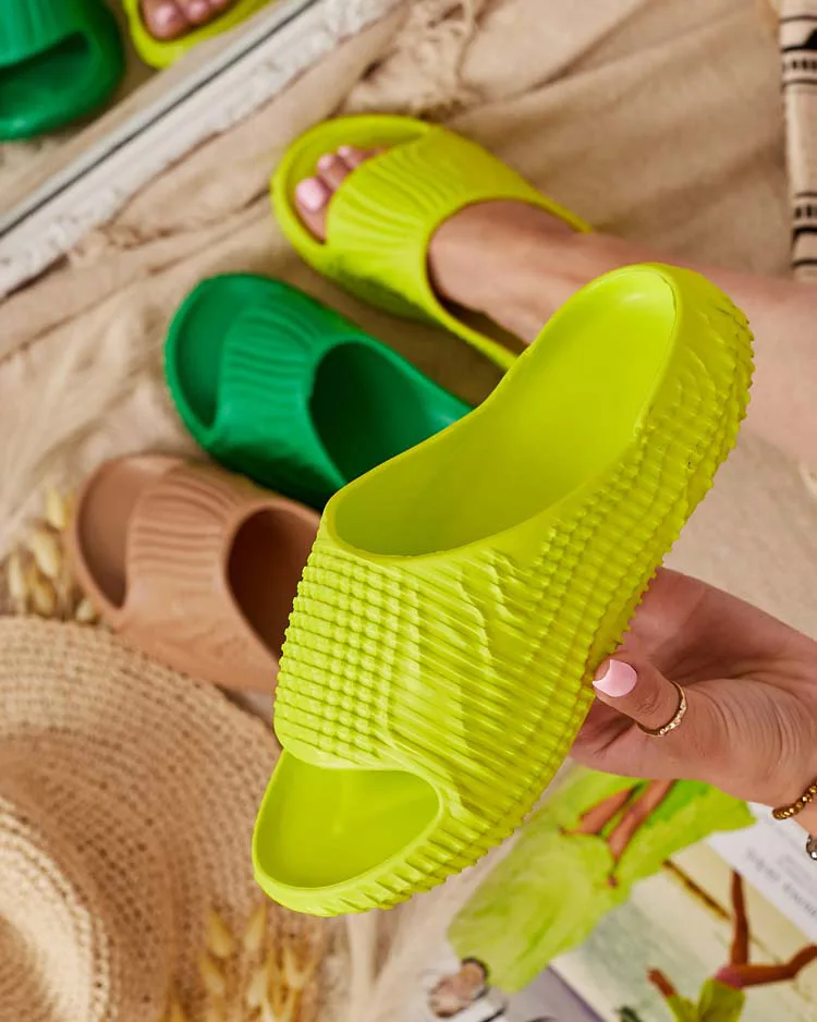 - Отличные женские резиновые шлепанцы на плоской подошве. Они имеют декоративный рельефный резиновый верх. Отличный выбор для отпуска!