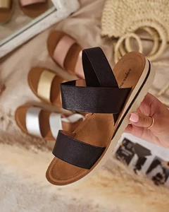 - Женские сандалии на плоской подошве - идеальная идея для жарких летних дней. Модель полностью выполнена из экокожи, которая дарит приятный комфорт. Обувь скользит по ноге, имеет резинку.