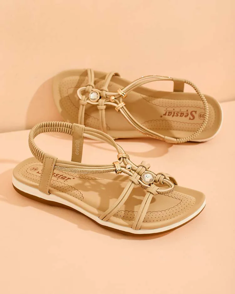 • Женские сандалии на плоской подошве - идеальная идея для жарких летних дней. Модель полностью выполнена из экологичной кожи. Верх украшен стразами и декоративными цирконами.