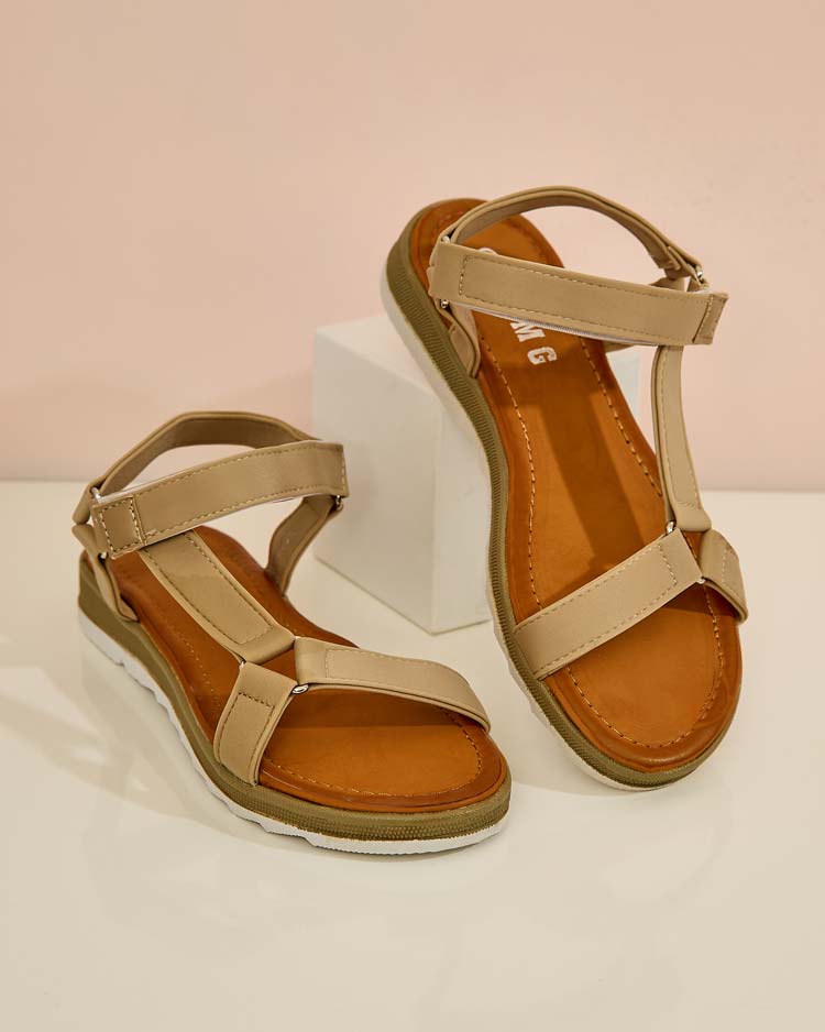 - Женские сандалии на плоской декоративной подошве. Выполнены из приятной ткани, стелька из экокожи. Обувь застегивается на липучки. Отлично подойдут для создания модных летних нарядов!