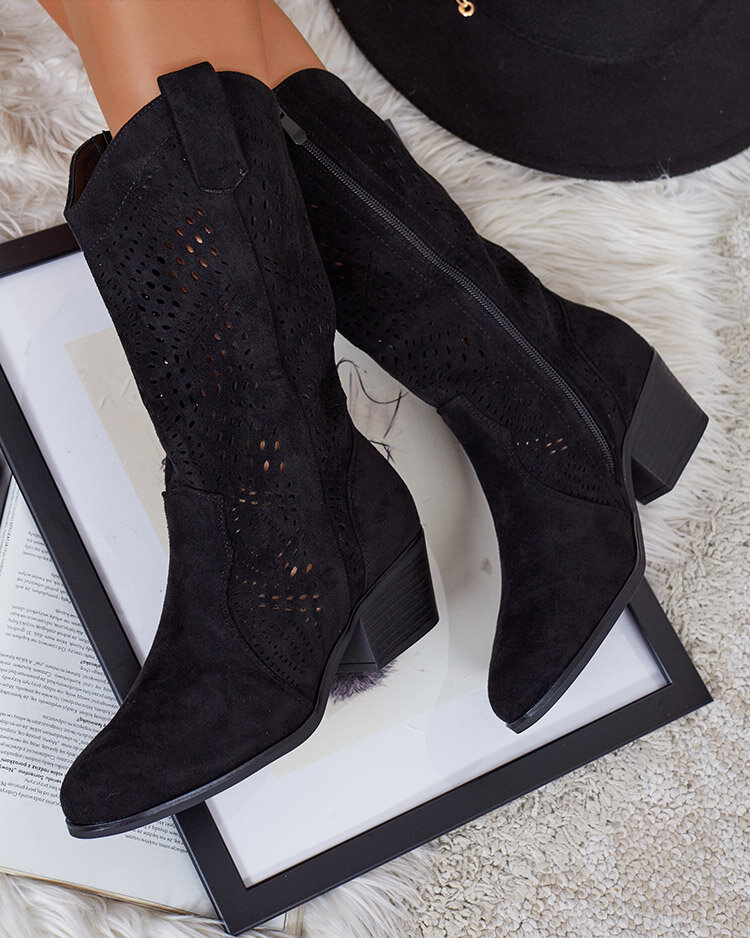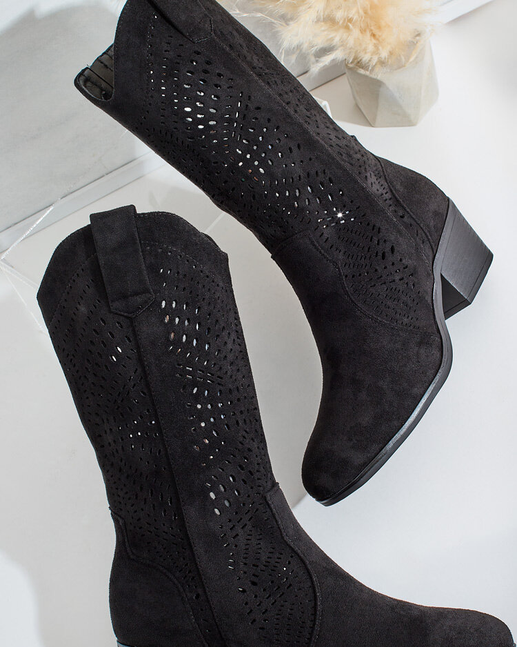 - Ботильоны а'ля ковбойские сапоги на шпильке, выполненные из органической замши с ажурной отделкой. Тканевая стелька, застежка на молнию. Они подходят ко многим женским стилям!