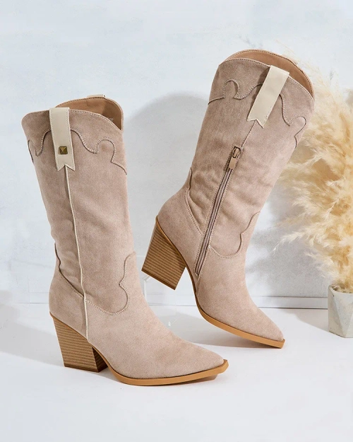 - Сапоги а'ля ковбойские сапоги на низком каблуке, выполненные из органической замши с декоративным тиснением. Тканевая стелька, сапоги с застежкой-молнией до середины голенища. Обувь отделана нежным мехом. Они подходят ко многим женским стилям!
