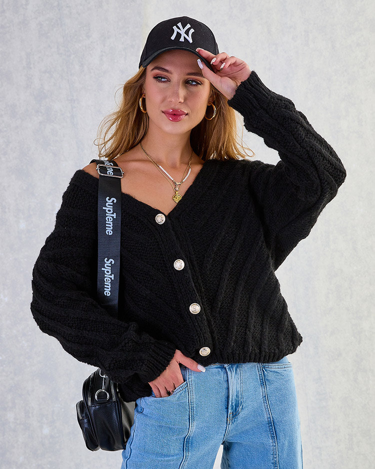 - Женский свитер с вырезом сердечком выполнен из приятной трикотажной ткани. Модель имеет декоративные съемные пуговицы. Отличная основа для прохладных дней!