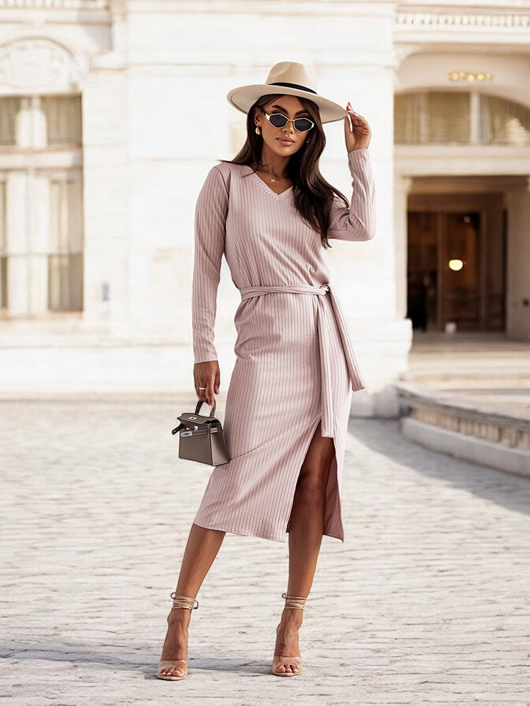 - Женское платье до середины бедра, с длинными рукавами и вырезом сердечком. Модель имеет ребристую ткань и элегантный разрез до середины бедра. Кроме того, в комплект входит пояс. Must have этого сезона! ПРИМЕЧАНИЕ: Точность измерений (+/-) 1 см.