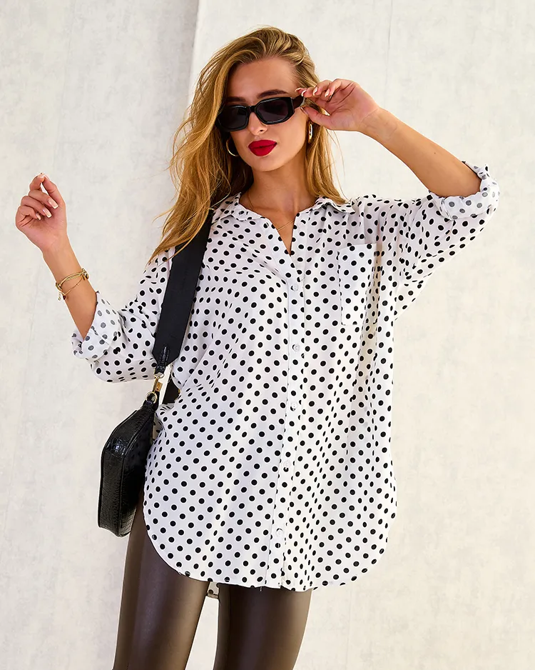 - Сенсационная женская рубашка в горошек с закатанными рукавами. Модель с отложным воротником, застегивается на пуговицы. Обязательно должна быть в шкафу каждой женщины!