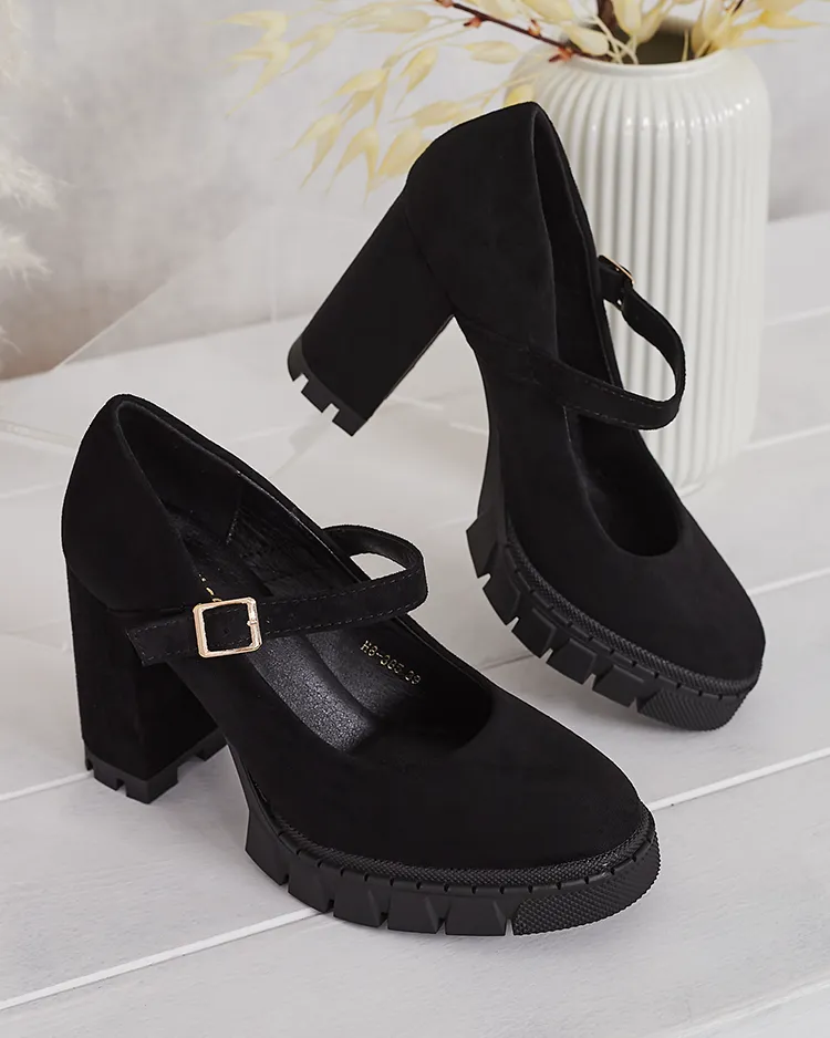 - Модные туфли на каблуке и толстой подошве из элегантной экозамши, с удобной стелькой из экокожи. Модель застегивается на пряжку. Носите их с любым платьем из вашего гардероба!