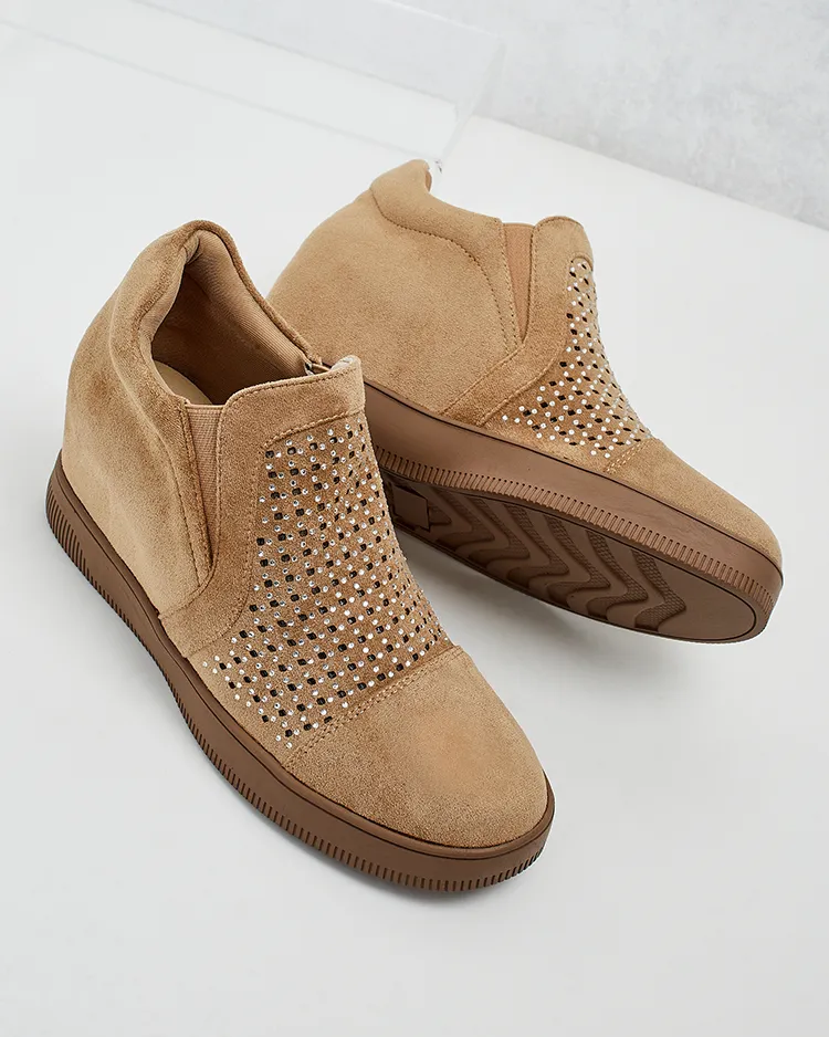 - Модные женские спортивные туфли на скрытом якоре, выполненные из эко-замши. Внутри мягкая стелька из эко-кожи. Туфли-слипы, украшенные цирконами. Станут отличным украшением для повседневного стиля.