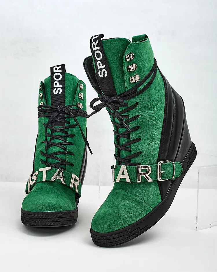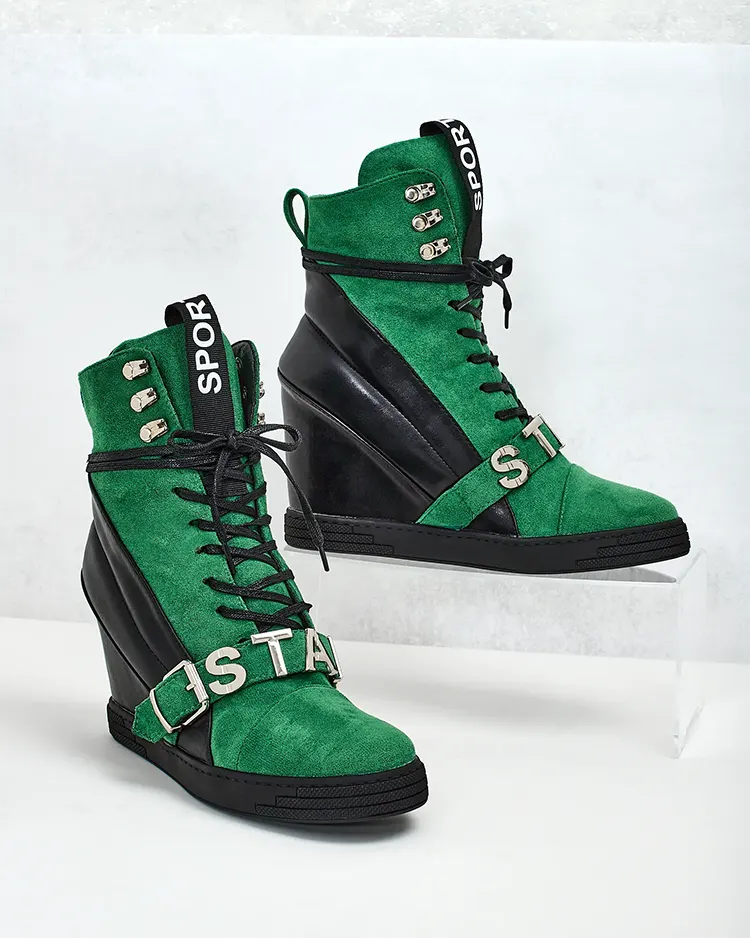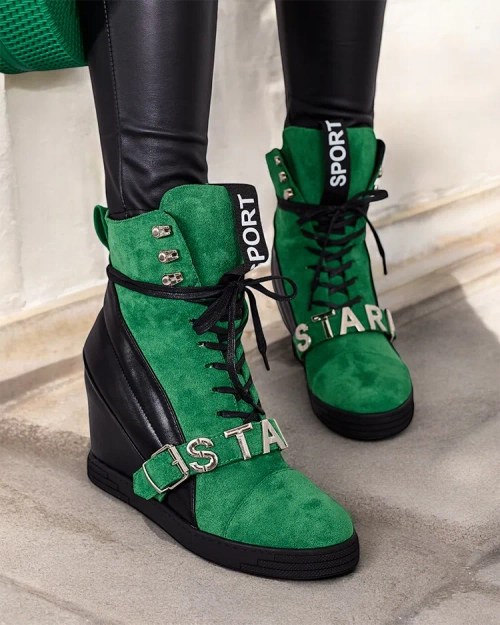 - Спортивные женские ботильоны на каблуке, выполненные из комбинации эко-кожи и эко-замши. Ботинки с декоративной отделкой в верхней части, тканевая стелька внутри.