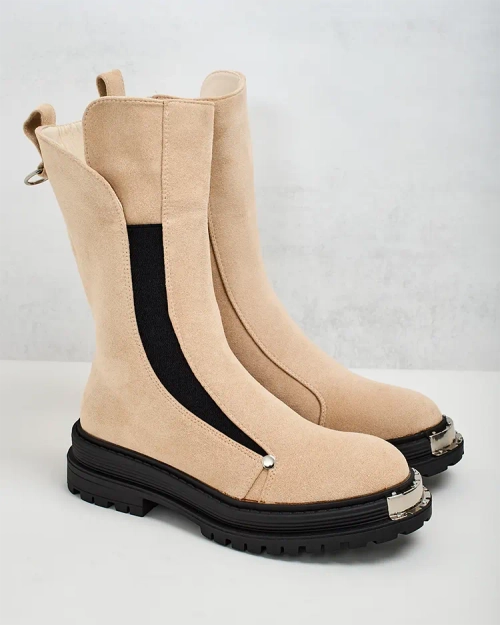 - Женские высокие сапоги на плоской подошве, выполненные из эко-замши. Внутри подкладка из мягкого меха, модель на молнии. Идеальный вариант для осени!