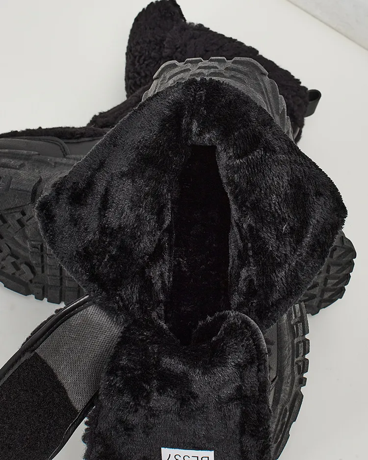 - Нестареющие женские снежные сапоги. Верх выполнен из экологичной кожи со вставками а'ля овчина. Утеплитель в виде меха внутри, ботинки застегиваются на липучку. Идеальный вариант для холодного времени года!