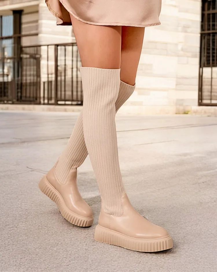 - Стильные женские сапоги по колено на толстой подошве. Верх выполнен из эластичного ребристого материала и имеет вставки из экокожи. Меховая стелька. Модель "слип-он".