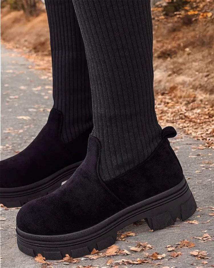 • Стильные женские сапоги до колена на плоском каблуке. Верх выполнен из эластичного тканевого материала в сочетании с эко-замшей, внутри меховая стелька. Модель слип-он. Идеальный вариант для повседневных осенних нарядов!