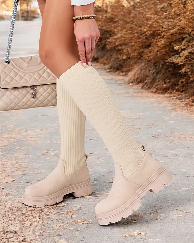 - Стильные женские сапоги до колена на плоском каблуке. Верх выполнен из эластичного тканевого материала в сочетании с эко-замшей, внутри меховая стелька. Модель слип-он. Идеальный вариант для повседневных осенних нарядов!