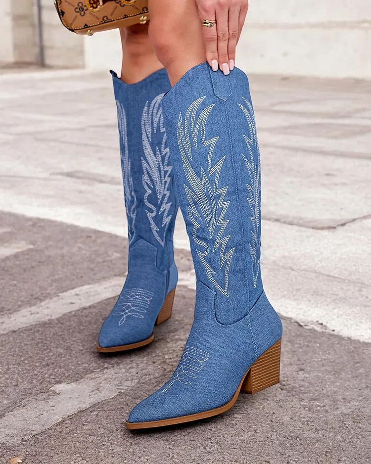 - Сапоги а'ля ковбойские на низком каблуке, выполненные из приятной ткани с декоративным тиснением. Тканевая стелька, сапоги с молнией до середины голенища. Они подходят ко многим женским стилям!