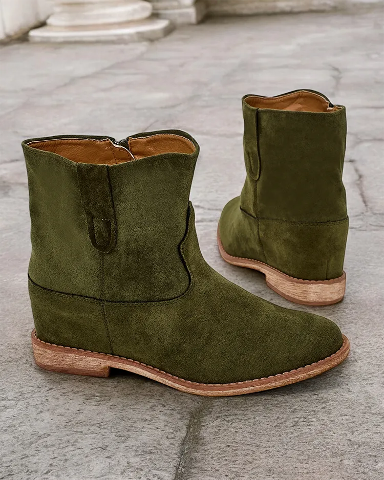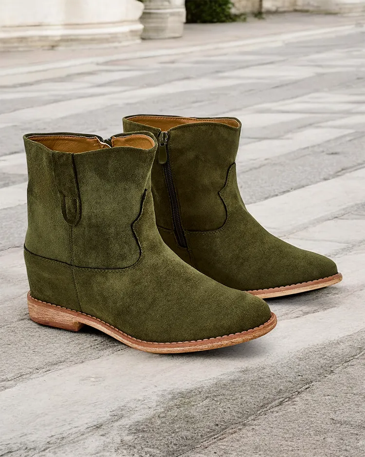 - Бежевые ботинки в стиле ковбоя из кожи, имитирующей замшу. Модель имеет утепление внутри в виде мягкого меха. Обувь на низком покрытом клиновидном каблуке. Обувь застегивается на молнию.