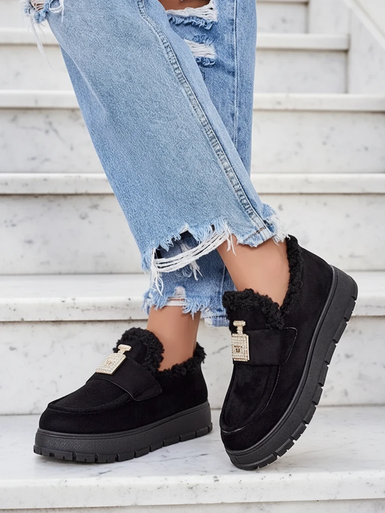 • Утепленные женские мокасины на платформе. Классическая модель из замшевой экологической кожи и наполнения a' la овчина. Подошва в форме платформы. На голенище несъемное украшение с цирконами.