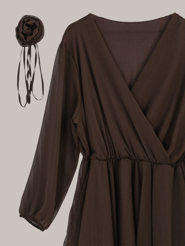 - Элегантное, вечное женское платье до колена с обмоточным вырезом и эластичным поясом. Платье имеет длинные рукава из сетки и декоративный дополнительный пояс с цветком. Отличный выбор для вечернего выхода!