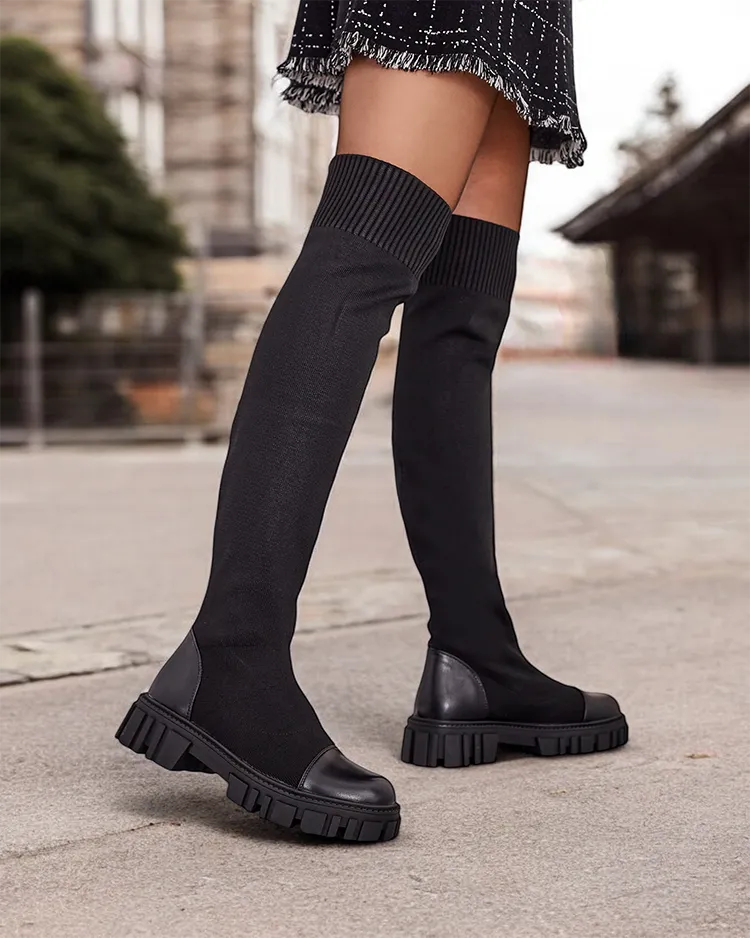 • Стильные женские сапоги выше колена на толстой подошве. Верх изготовлен из гибкого тканевого материала с вставками из эко-кожи, с тканевой стелькой внутри. Модель на застежке. Идеально подходят для повседневных осенних нарядов!