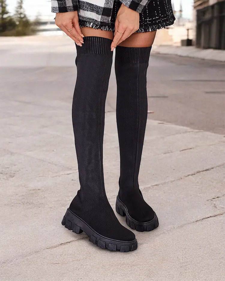 • Стильные женские платформенные сапоги. Верх выполнен из гибкого тканевого материала, с тканевой стелькой внутри. Модель без застежки. Идеально подходит для повседневных осенних нарядов!