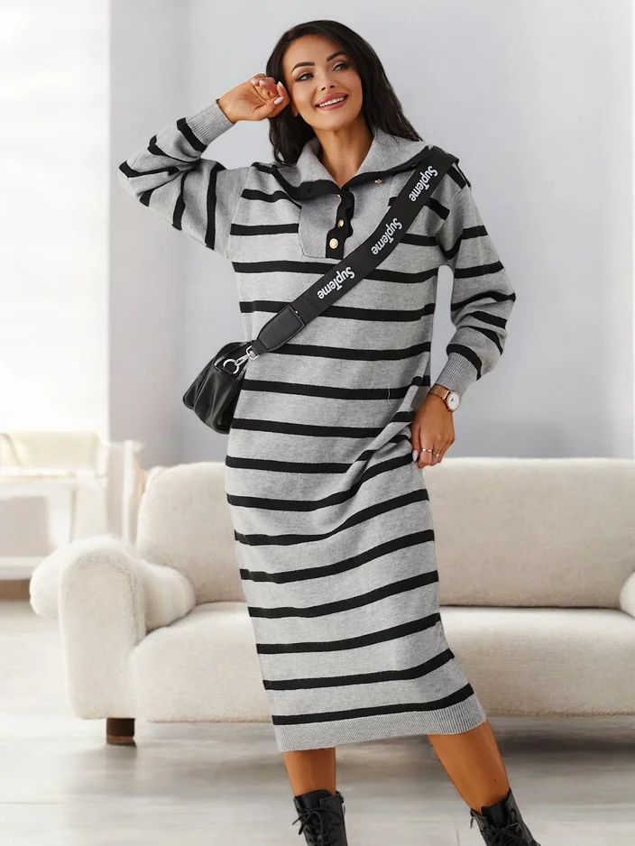 - Женское миди-платье-свитер с длинными рукавами. Модель из вязаного полотна. Горловина застегивается на пуговицы. Незаменимая вещь этого сезона! ВНИМАНИЕ: Точность измерения (+/-) 1 см. Измерения проводятся на плоской поверхности.