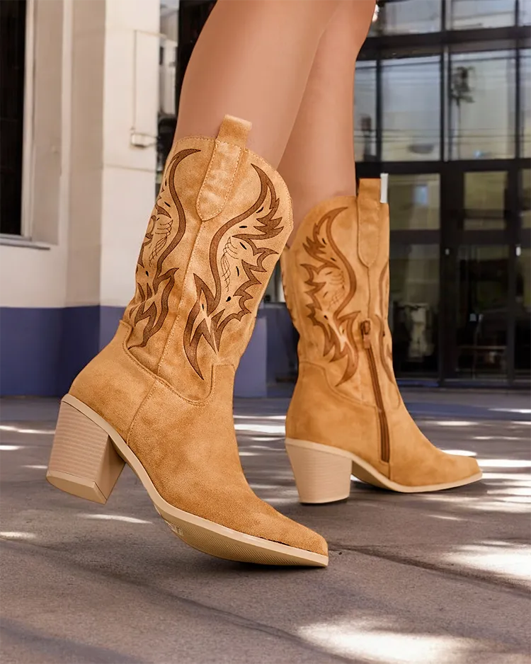 • Ботинки в стиле ковбоя на каблуке, изготовленные из искусственной замши. Эко-кожаная стелька, обувь застегивается на молнию, украшена тиснением. Они подходят к многим женским стилям!