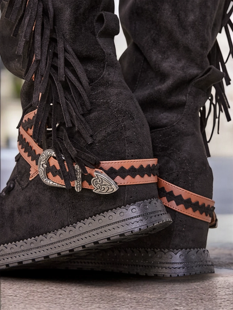 - Стильные ботфорты до колена для женщин с скрытой клиновидной пяткой. Верх выполнен из эко-замши. Подкладка из ткани. Модель без застёжек, украшенная бахромой и тиснеными ремешками.