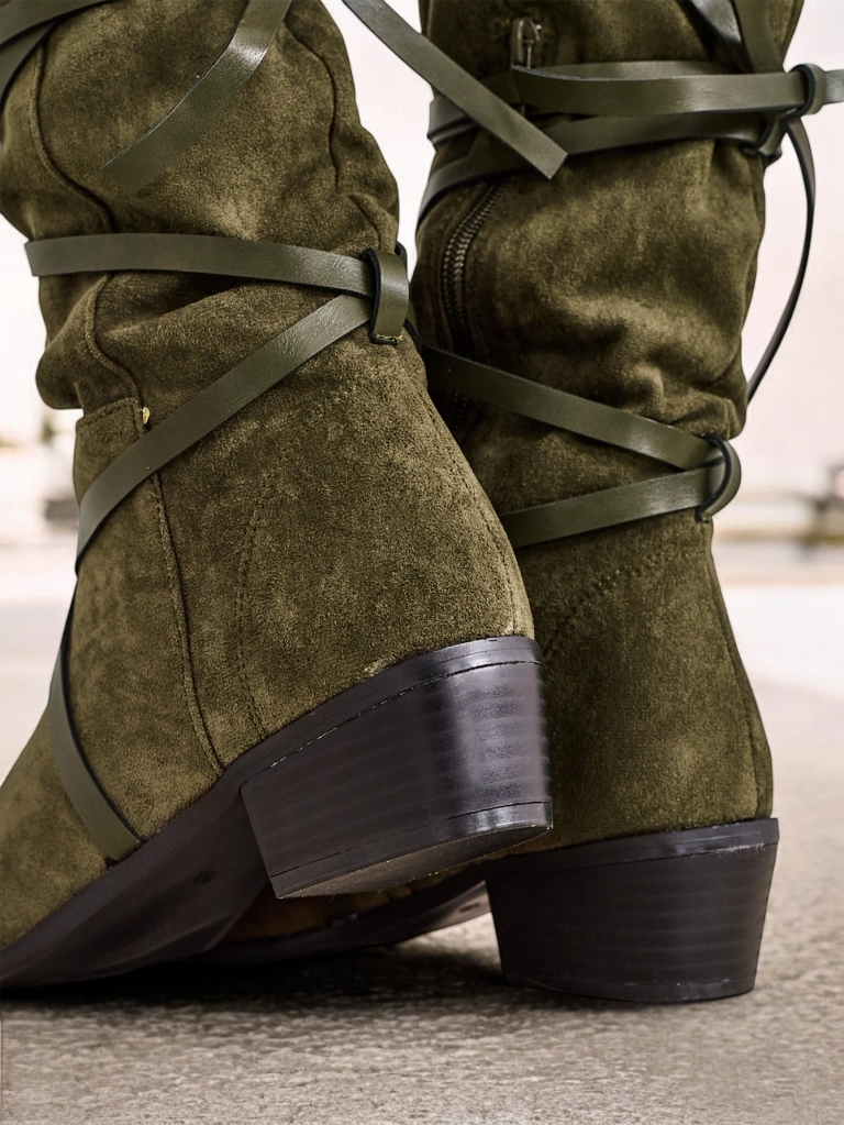- Gustowne kozaki na niskim obcasie z noskiem w szpic. Model posiada cholewkę wykonaną z eko-zamszu oraz wkładkę z eko-skóry. Obuwie zapinane na suwak. Idealne do jesiennych kreacji!