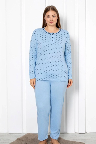 - Женский пижамный комплект из 2 предметов, выполненный из хлопковой ткани с декоративным принтом. В комплект входит блуза с длинным рукавом на пуговицах и брюки с эластичным поясом и прямыми ногами.