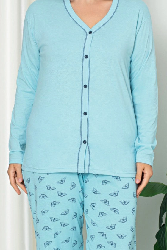 • Женская 2-х предметная пижама из хлопчатобумажной ткани с декоративным принтом. В комплект входит блуза с длинными рукавами и пуговицами, и брюки с эластичной талией и прямыми ногами.