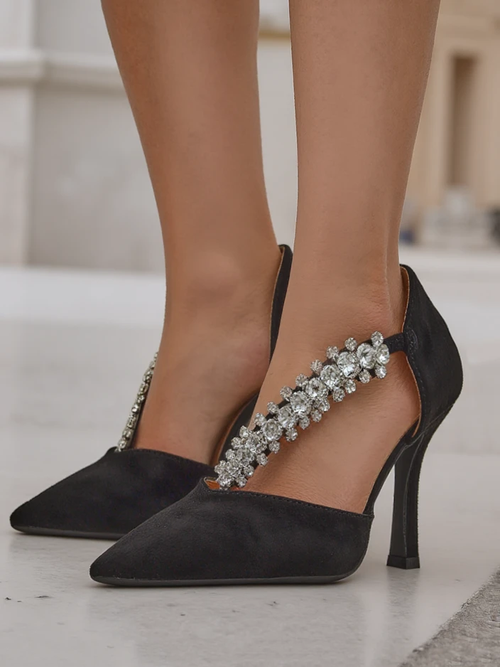 - Элегантные женские шпильки, выполненные из экосмягкого материала, украшенные стразами посередине. Внутри обувь облицована экокожей, а заостренный носок визуально удлиняет ноги.