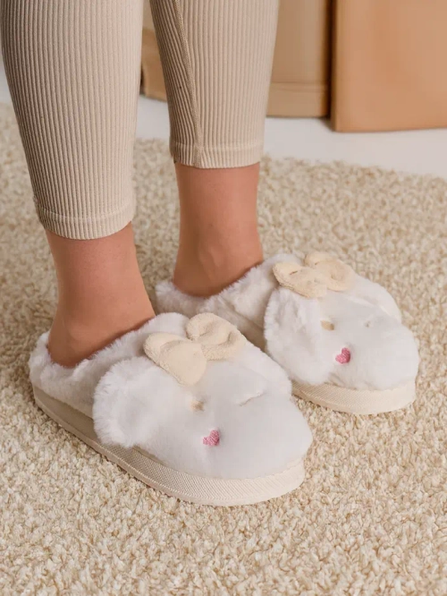 - Удивительные женские тапочки на плоской подошве, украшенные бантом. Модель выполнена из материалов, имитирующих мех. Отличный вариант для домашних нарядов!