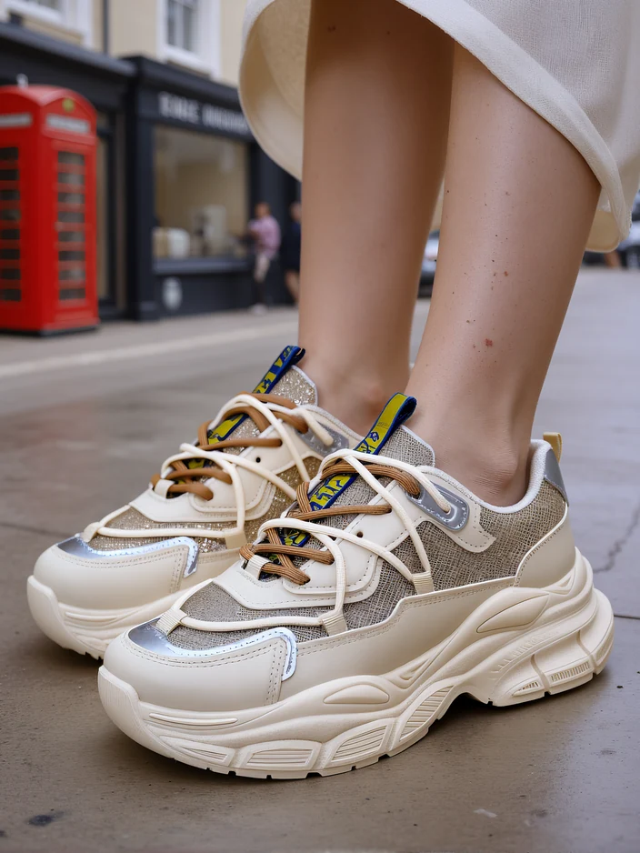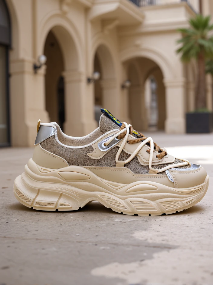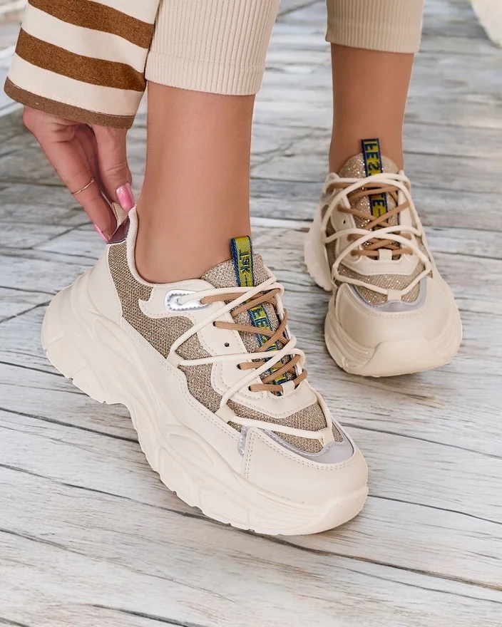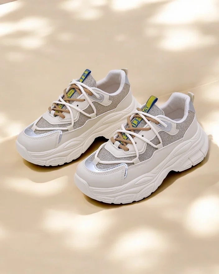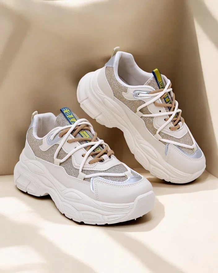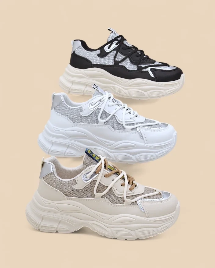 - Женская спортивная обувь в виде кроссовок на толстой подошве. Изготовлены из экокожи с блестящими вставками. Текстильная стелька. Отличное дополнение к вашим повседневным нарядам!