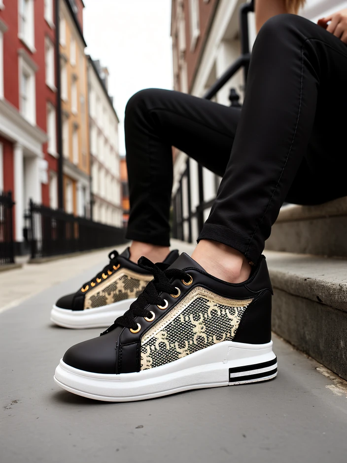 - Удобные женские спортивные туфли с скрытой платформой, изготовленные из эко-кожи и принтованной ткани. Модель на шнуровке, текстильная стелька. Эластичный верх аккуратно адаптируется к стопе. Супер стильное дополнение!