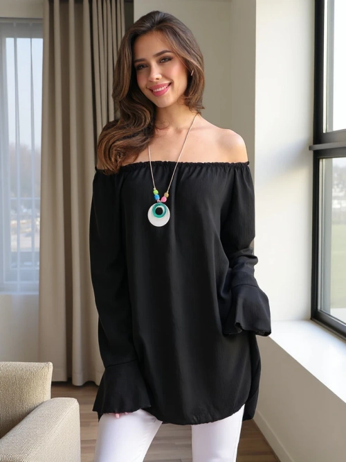 - Исключительная женская блуза в испанском стиле, выполненная из мягкого, приятного материала. Она имеет круглую горловину с резинкой и рукава, украшенные рюшами. Кроме того, в комплект входит ожерелье. Идеально подходит как для повседневной носки, так и дл