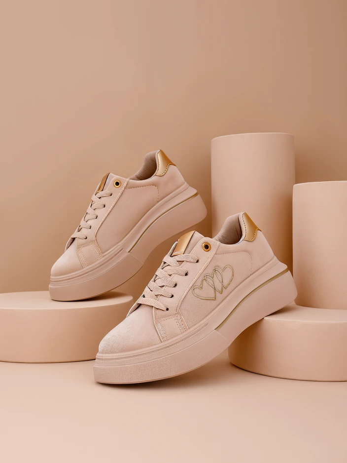 - Женские спортивные кроссовки с плоской подошвой, выполненные из эко-замши. Модель оснащена эко-кожаной стелькой и украшена вышитыми сердечками. Сочетайте их с широкими брюками и рубашкой!