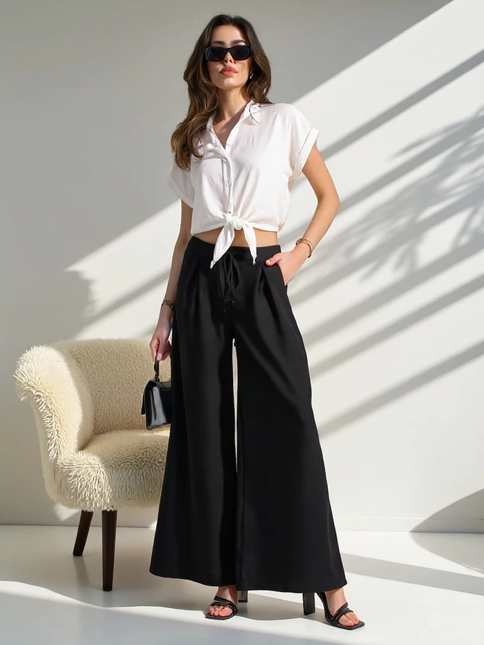 - Удивительные широкие брюки из легкой ткани, модель с эластичным поясом и шнурками. Обязательная вещь в вашем гардеробе! ЗАМЕТКА: Точность измерений (+/-) 1 см.