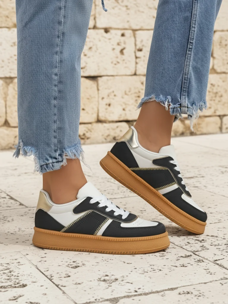 • Женские кроссовки, полностью изготовленные из экокожи, сочетают в себе современный дизайн и комфорт. Более толстая подошва обеспечивает амортизацию, а шнуровка позволяет идеально подогнать обувь по ноге. Удобные и стильные - подходят для многих стилей.