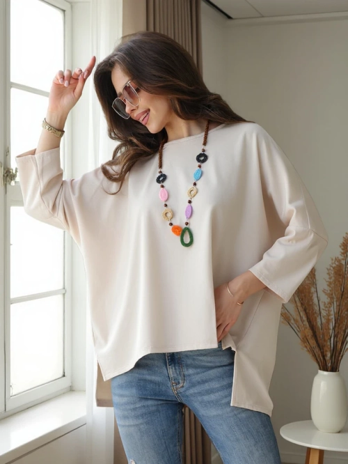 - Оригинальная женская блузка с круглым вырезом, выполненная из приятной и мягкой ткани. Этот товар имеет свободный крой и длинные рукава 3/4. В комплект также включено ожерелье. Идеальный выбор для создания стильных образов!