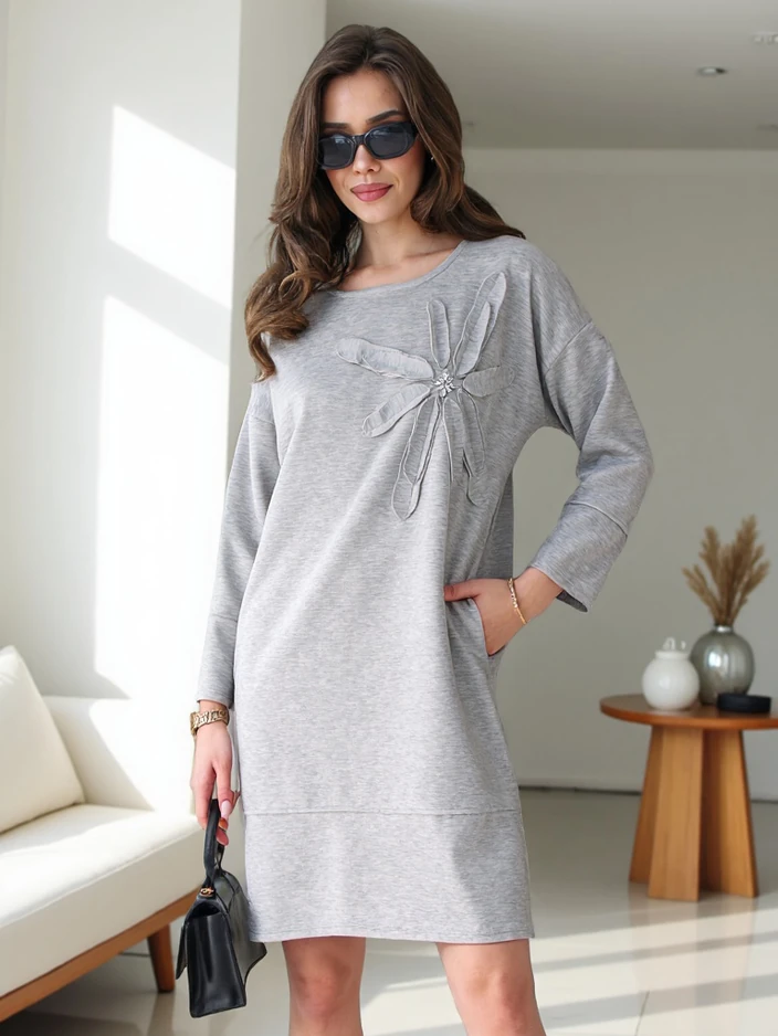 - Повседневное женское платье до колен с рукавами 3/4 и круглым вырезом. Модель украшена декоративным цветком. Обязательное приобретение в этом сезоне! ПРИМЕЧАНИЕ: Точность измерения (+/-) 1 см. Размеры измерены в расправленном виде.
