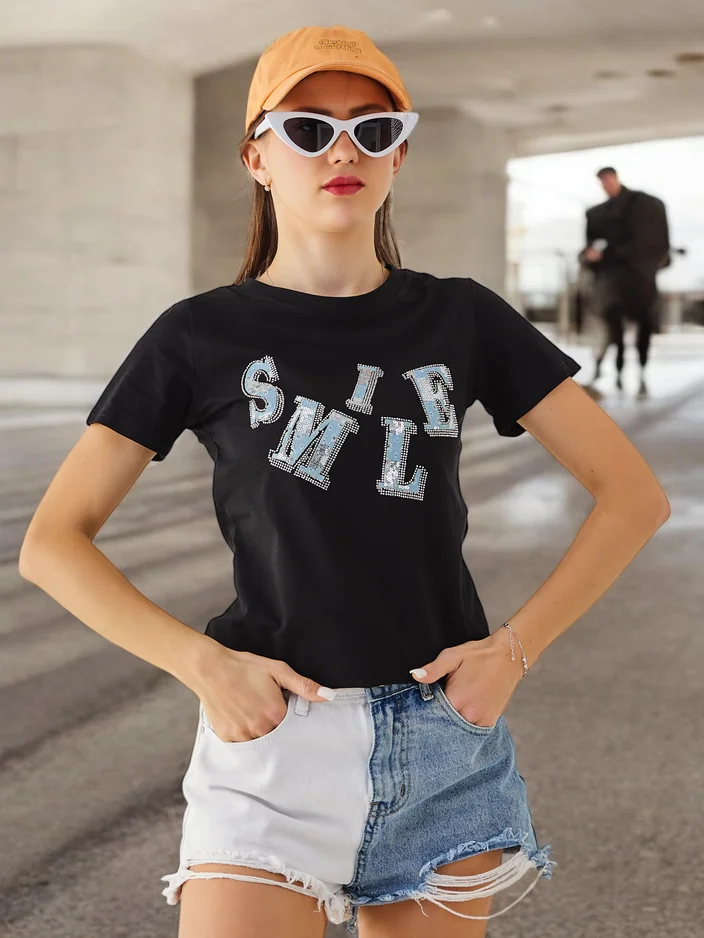 • Оригинальная женская блузка с круглым вырезом, выполненная из мягкой и приятной на ощупь ткани. Весь предмет украшен тонкой надписью, а короткие рукава придают легкость. Идеальный выбор для создания модных и стильных образов!
