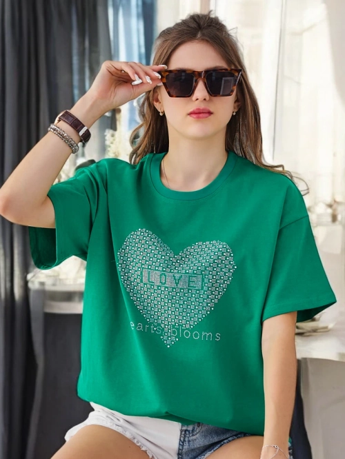 - Женская хлопковая футболка — легкий и удобный вариант на каждый день. Вдохновленная стразами, она идеально подходит для повседневных образов. Мягкая ткань обеспечивает комфорт, а минималистичный дизайн делает её универсальной для различных нарядов.