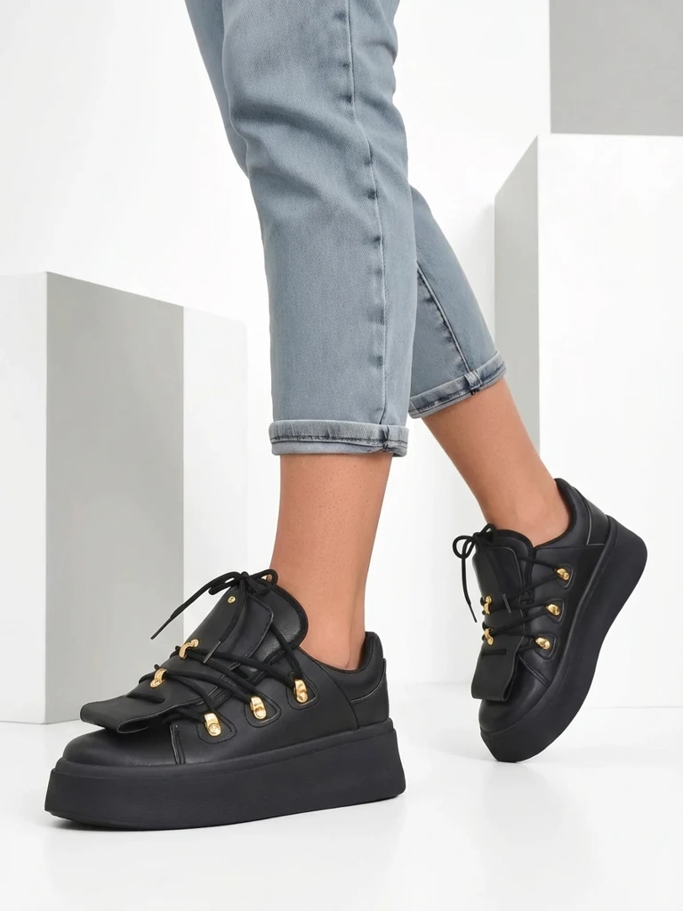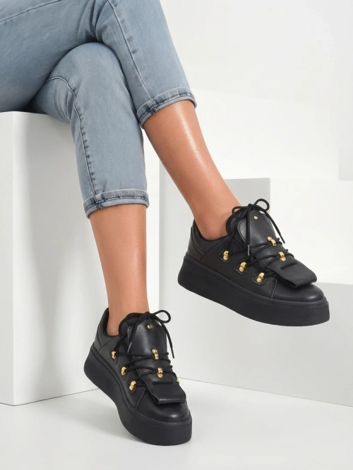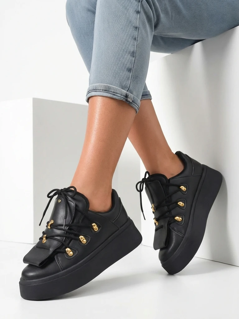 Кроссовки Royalfashion для женщин с декоративным язычком. Стильные женские кроссовки на толстой подошве. Верх изготовлен из синтетической кожи и имеет шнуровку. Внутренняя часть выполнена из приятной ткани. Модель оснащена декоративным язычком. Идеально п
