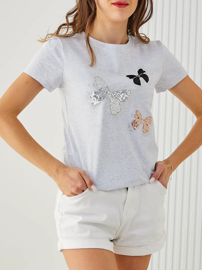 • Оригинальная женская блузка с круглым вырезом, сшитая из мягкой и приятной на ощупь ткани. Вся блузка украшена яркими пайетками, а короткие рукава добавляют легкости. Идеальный выбор для создания модных и стильных образов!